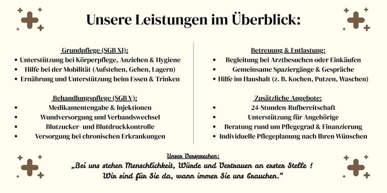 Gleichzeitig ist uns die persönliche Nähe besonders wichtig: ein freundliches Lächeln, ein offenes Ohr und die Zeit für ein Gespräch gehören für uns genauso zur Pflege wie fachliche Kompetenz. Denn wir sind überzeugt, dass Pflege mehr ist als medizinische Versorgung – sie bedeutet Menschlichkeit, Begleitung und Vertrauen.